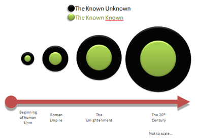 We are increasing the amount of the “Known Knows”, but each time the amount of the “Known Unknowns” increase with it. Answers beget more questions. And we have no idea of the size of the “Unknown unknowns”. The idea that the “relentless increase in the things we’ve proven about the universe” will remove areas for God to hide from the cleansing light of rational analysis is wrong.